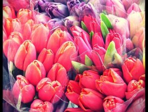 Cheerful tulips let us know that Spring has arrived, safely. Arranged in a clear vase.