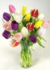 Cheerful tulips give us hope for Spring’s timely arrival. Arranged in a clear vase.